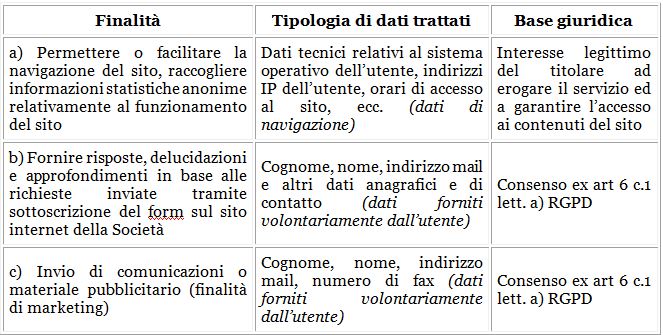 Finalità del trattamento, tipologia di dati e relativa base giuridica